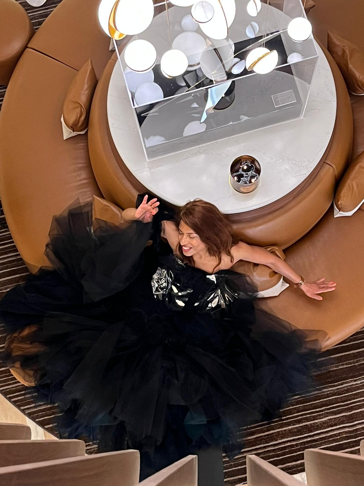Une fois préparée, le shooting peut démarrer ! Ses 25 ans passés dans l’industrie de la mode ont rendu son regard ultra-créatif, aguerri et prêt à s’adapter à tout environnement. Thiery PIETU a repéré dans le hall d’entrée de l’hôtel Le Gray d’Albion un joli canapé caramel de forme circulaire, avec de beaux luminaires suspendus juste au-dessus, près d’un escalier or et marbre. Visuellement, nous retrouvons instantanément les codes du luxe utilisés dans les photos glamour publiées dans les jolis magazines en papier glacés !