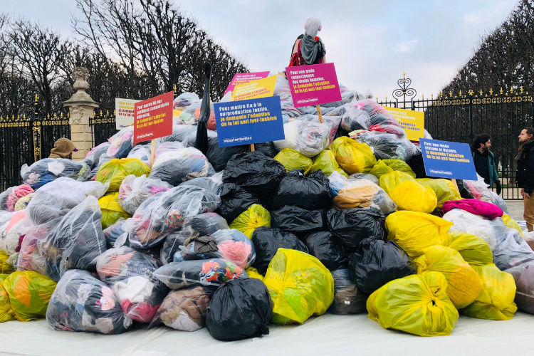 10 Tonnes de vêtements jetables ont été déversé devant le Sénat pour exiger le vote de la loi anti fast-fashion